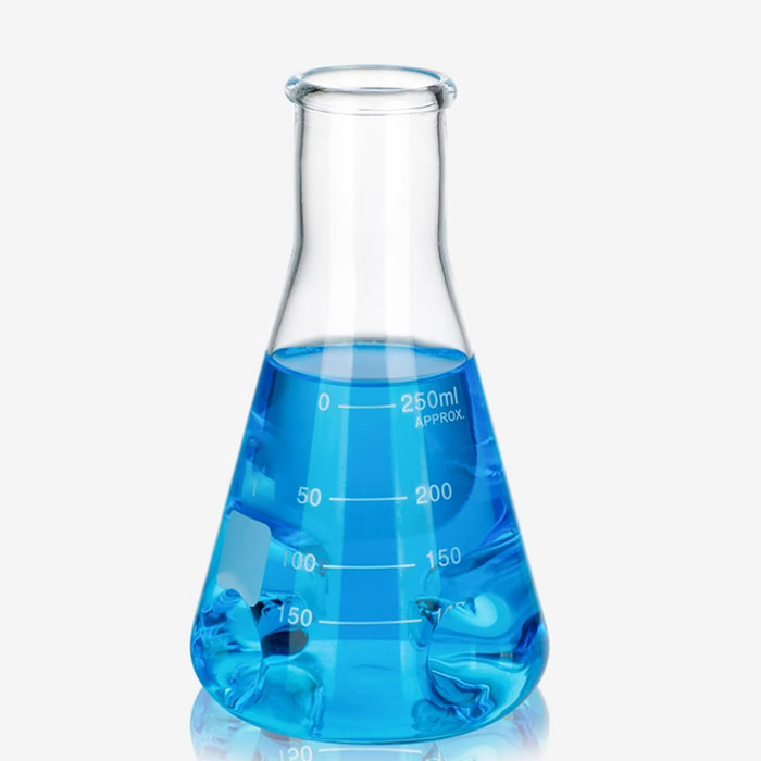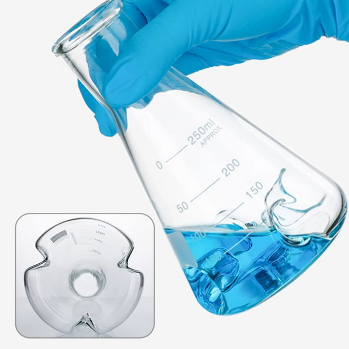 The conical flask with baffle bottom is widely used in chemical experiments, mainly for bacterial culture or storing various chemical reagents and solutions.