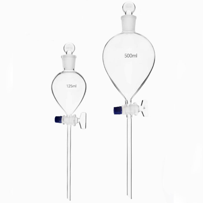 The globe shape separatory funnel can accurately separate two immiscible liquids. During the liquid separation operation, due to its special structural design and piston control, according to the density difference of the liquid, the piston can be opened first to release the lower liquid, and then the upper liquid can be poured out from the top of the funnel after closing the piston, thereby achieving efficient and accurate separation. liquid effect. For example, in the separation experiment of organic solvents and water, the separatory funnel can separate the two very well.In some chemical reactions that require controlling the dripping speed of liquid, the separatory funnel can be used as a liquid adding device. By adjusting the piston, the rate of liquid addition is controlled, thereby controlling the speed of the reaction. For example, in some slow reaction experiments, slowly adding reactants through a separatory funnel can better observe the reaction process and control the reaction conditions.