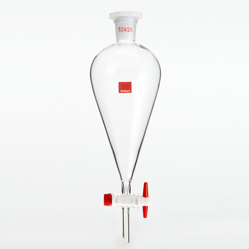 Pear-shaped design is narrow at the top and wide at the bottom. This structure makes the layered interface of liquids clearer during the liquid separation process, makes it easy to observe and accurately separate liquids of different phases. The neck of the pear-shaped separatory funnel is shorter. Compared with the spherical separatory funnel, the pear-shaped separatory funnel has a shorter neck, which is more convenient to operate during use. Especially during extraction operations, it can better control the outflow speed and flow rate of the liquid. It is not easy for liquid splashing and other situations to occur.It can accurately separate two immiscible liquids. During the liquid separation operation, due to its special structural design and piston control, according to the density difference of the liquid, the piston can be opened first to release the lower liquid, and then the upper liquid can be poured out from the top of the funnel after closing the piston, thereby achieving efficient and accurate separation. liquid effect.For example, in the separation experiment of organic solvents and water, the separatory funnel can separate the two very well. In some chemical reactions that require controlling the dripping speed of liquid, the separatory funnel can be used as a liquid adding device. By adjusting the piston, the rate of liquid addition is controlled, thereby controlling the speed of the reaction. For example, in some slow reaction experiments, slowly adding reactants through a separatory funnel can better observe the reaction process and control the reaction conditions.
