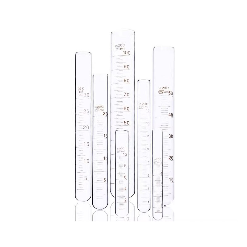 Test tubes with graduations usually have a cylindrical design for ease of holding and handling. The mouth of the tube is finely polished, smooth and burr-free, the scale is precise and clear and easy to read, and wear-resistant.