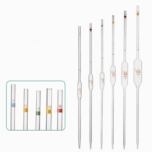 Glass volumetric pipettes are commonly used glass measuring instruments in laboratories, which are used to accurately transfer a certain volume of liquid. The scales are clear and easy to read, enabling users to quickly and accurately read the volume values of the liquid that has been sucked up or dispensed, thus improving the efficiency and accuracy of experimental operations.