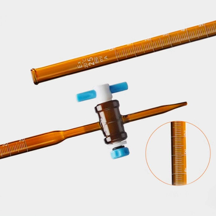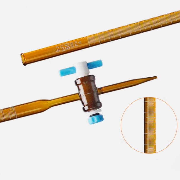 The brown glass burette is of Class A accuracy. Its tube body is made of high-quality brown glass, which effectively blocks light and is particularly suitable for titration operations of light-sensitive solutions. It is equipped with a PTFE stopcock, which has excellent chemical stability and is resistant to corrosion from various strong acids, strong alkalis, and organic solvents, ensuring stable operation in complex chemical environments. The scale on the tube body is clear and the graduations are precise, enabling high-precision volume measurement to meet the strict requirements for data accuracy in various experiments and analyses.