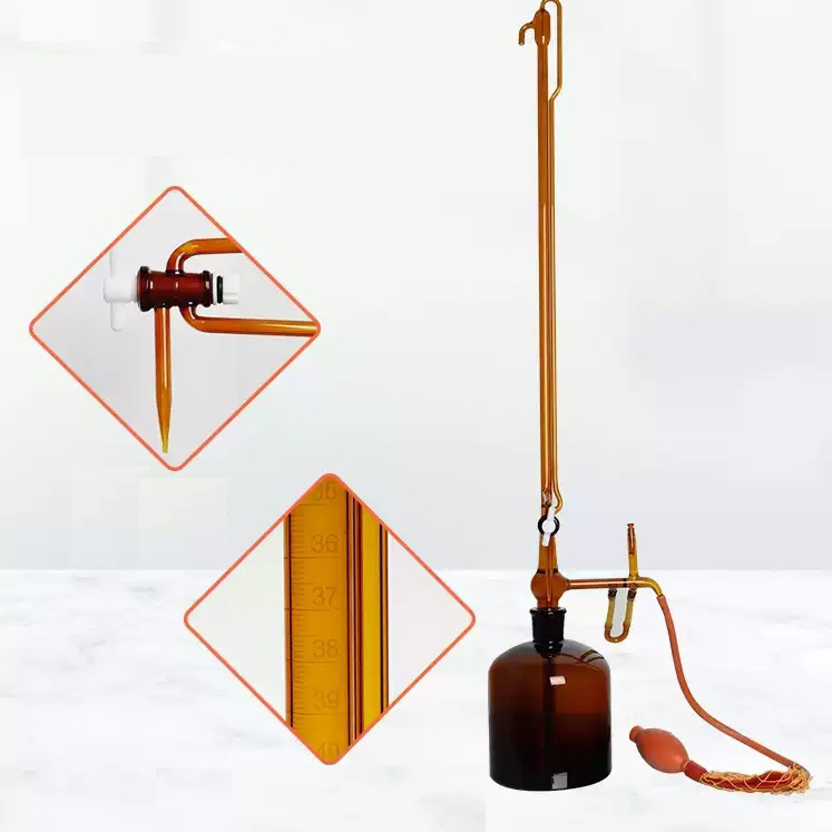 The automatic burette uses air pressure to pump the titration fluid in the liquid storage bottle into the burette. When it reaches the zero mark, the excess liquid automatically flows back to the liquid storage bottle through the diversion port. After titration, if there is residual liquid in the graduated tube, you can also use the piston to put it back into the liquid storage bottle. When the air is too much, you can use the automatic piston to deflate and stop the liquid level from rising; when you re-inflate, the automatic piston automatically closes, which is better than other methods. The form automatic buret is easy to use.
