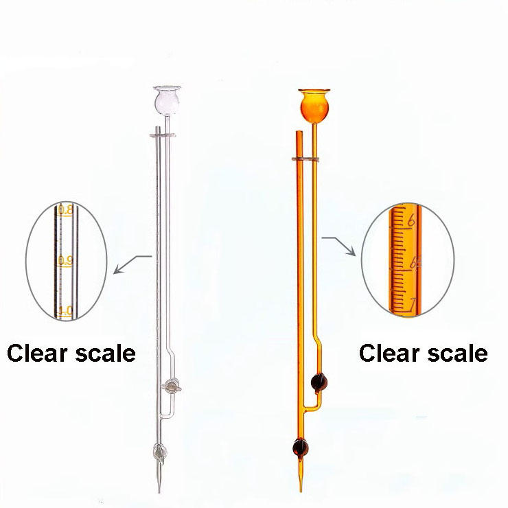 Class A micro burette with side filling tube has a special clip-on design that can be easily fixed on an experimental device, such as an iron stand, etc., makes the titration operation more stable and preventing the burette from shaking due to accidental touching during the operation, affecting the titration results. accuracy.