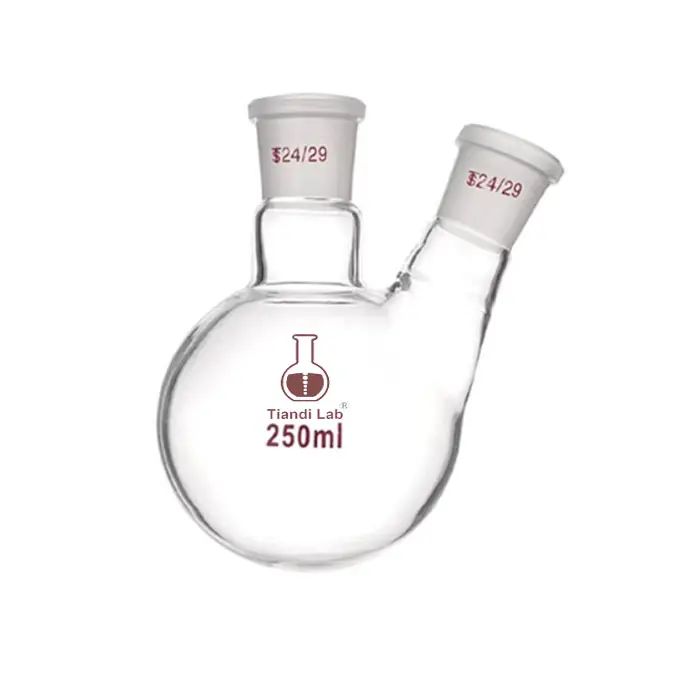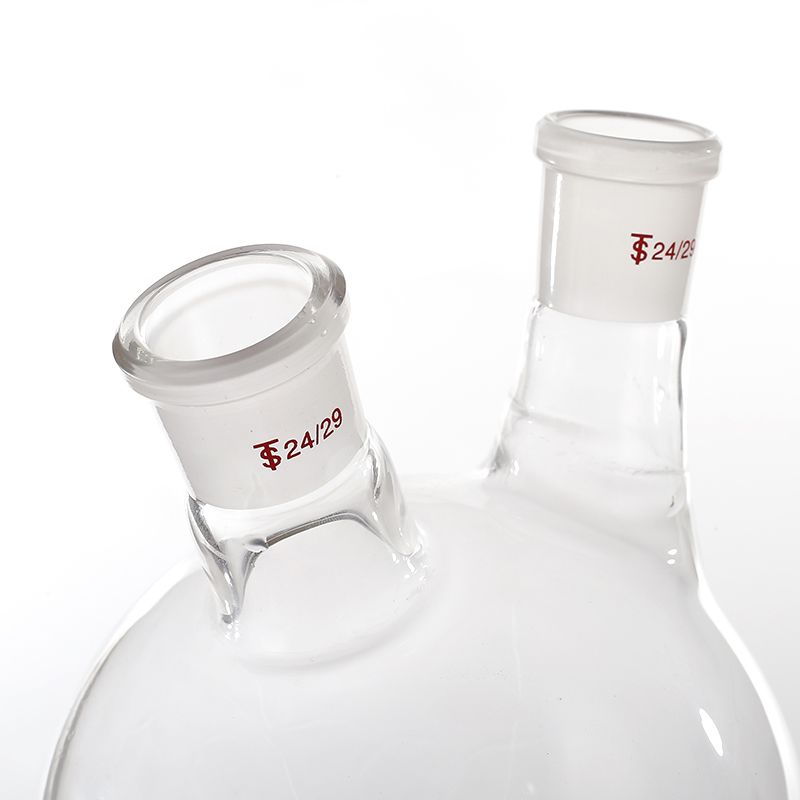Flasks oblique shape with two necks has two openings, provides more convenience and flexibility for experimental operations. Various instruments and equipment such as thermometers, condensation tubes, and dropping funnels can be installed at different openings according to experimental needs to enable multiple experimental operations to be performed simultaneously. The position and angle of the two mouths have been carefully designed to make the connection between various instruments more reasonable, make the operation more convenient, and also reduce interference factors during the experiment.