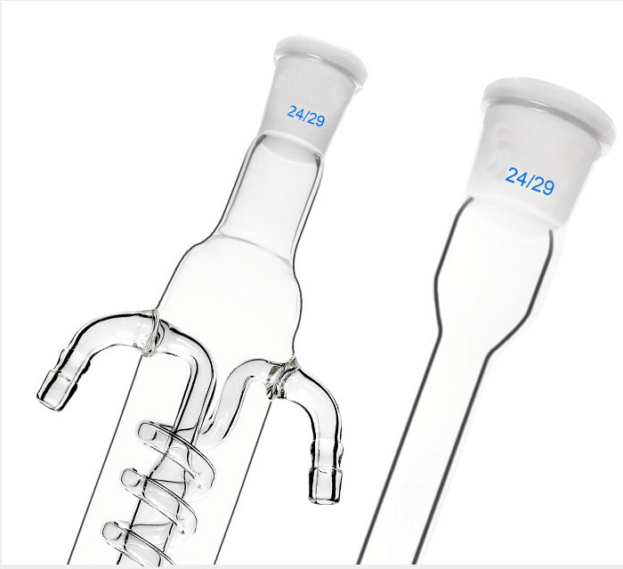 Reflux condenser with coiled inner tube is made of high borosilicate 3.3 glass, with fine workmanship, temperature resistance, acid and alkali resistance, durability, high transparency, clean and transparent; good light transmittance, stable material, lightweight and easy to use; fine frosting, standard caliber.
