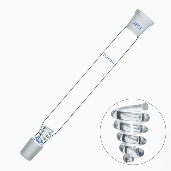 Filled type distilling cylinder with helix is made of high borosilicate glass, which has a very low thermal expansion coefficient, about one third of ordinary glass. The frosting is fine, the seal is leak-proof; the surface is smooth, beautiful and elegant, the transparency is high, and the surface is smooth.