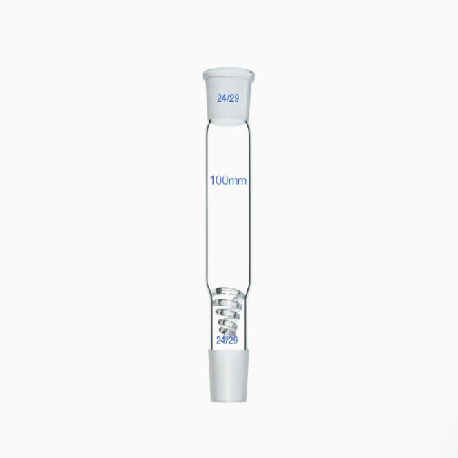 Filled type distilling cylinder with helix and standard ground mouth is a glass instrument used to separate and purify liquid mixtures in chemical experiments. The instrument interface is designed with standard ground mouth, and common specifications are 14, 19, 24, 29, etc. This ground mouth can be tightly connected with instruments such as distillation flasks, condensers, thermometer sleeves, etc. of the same specifications to ensure the sealing of the device, and it is convenient for quick assembly and disassembly of the experimental device. The fractionation column is usually a glass tube with a length of 10-50cm and a diameter of 15-25mm, and the column is filled with fillers4. The fillers are generally made of glass, porcelain or metal, such as glass beads, glass single rings, porcelain rings, metal wire mesh, etc. The presence of these fillers increases the gas-liquid contact area, so that the rising vapor and the descending condensate can fully exchange heat and substances.There is a spiral coil inside the column, which is usually made of glass or metal. The function of the spiral coil is to guide the vapor and liquid to be evenly distributed in the column, avoid channeling or wall flow, further increase the gas-liquid contact area, and improve the fractionation efficiency.