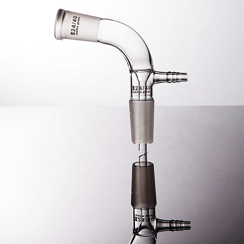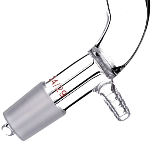Vacuum receiving tube 105°with standard ground mouth is a glass instrument used in experiments such as vacuum distillation in chemical laboratories. It is designed at a specific 105-degree angle so that the distillate can flow more smoothly into the receiving container, reducing residue and wall hanging. Common specifications include 14#, 19#, 24#, 29#, etc., which match the ground sizes of other instruments to ensure the tightness and sealing of the connection. It is mainly used as a connecting pipe in the distillation device. During the vacuum distillation process, it is used in conjunction with instruments such as distillation flasks and condensers to receive the distilled liquid. There is an exhaust branch pipe on the upper part of the tail plug, which is connected to the vacuum pump through a hose for exhausting and reducing pressure to create a reduced pressure environment. There are two main types: straight and curved, which can be selected according to the spatial layout of the experimental device and actual needs.